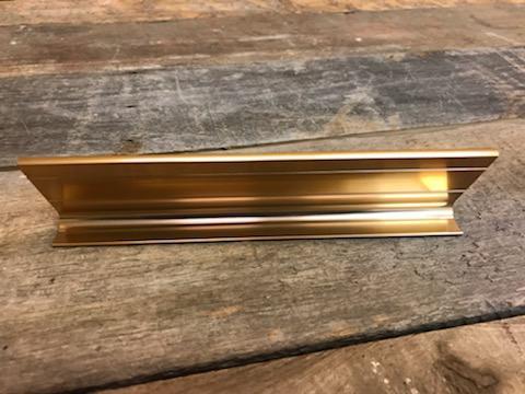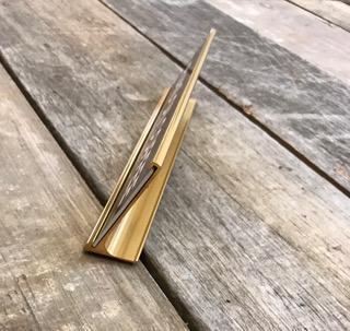 This desk sign is an engraved plastic made to look like wood, inside a gold metal stand.
